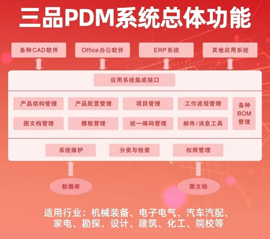 三品PDM系统基础功能覆盖产品数据管理及研发协同的各个方面,包括产品结构管理、图文档管理、产品配置管理、统一编码管理、工作流程管理、邮件管理及权限管理等,其他增强功能包括对各种CAD软件的集成、ERP集成、异地协同、其他应用系统集成及为企业提供个性化的定制开发服务。