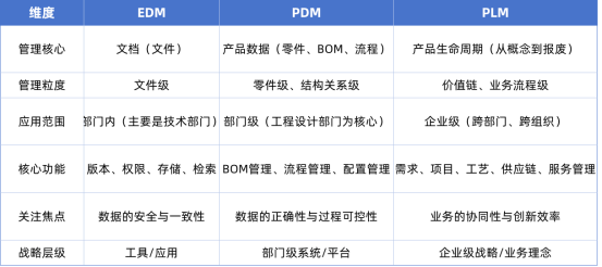 EDM、PDM、PLM三者呈现出清晰的继承、扩展与融合关系。