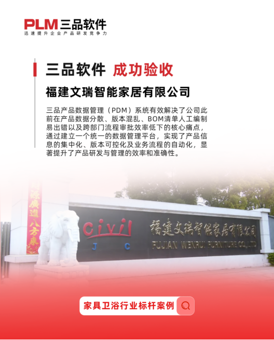 家居家具卫浴行业面临产品复杂度高、定制化需求旺盛、协同效率低下等问题制约企业发展。作为制造业数字化转型的核心工具,PLM系统通过整合产品研发全流程,正帮助多家企业实现提质增效与创新发展。三品软件作为国内领先的PLM解决方案提供商,深耕家居家具卫浴行业多年,积累了丰富的实践经验。三品PLM产品全生命周期管理解决方案,旨在赋能制造企业打造高效的研发协同平台,帮助企业迅速规范产品研发管理,迅速提升企业产品研发竞争力。
