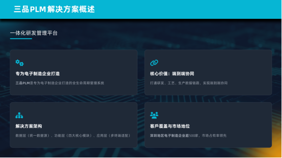 核心要点:三品PLM系统专为电子制造行业打造,以产品数据为核心,打通从概念设计到生产制造的完整链路,实现数据、流程、人员的全面协同。