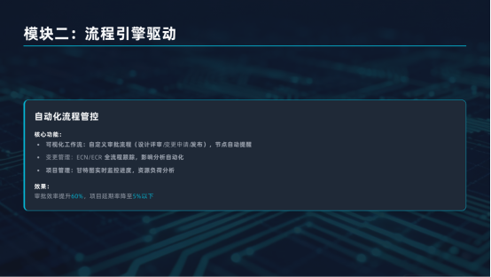 ●量化成果:设计数据查找时间减少70%,版本错误率降低90%,设计复用率提升25%以上。