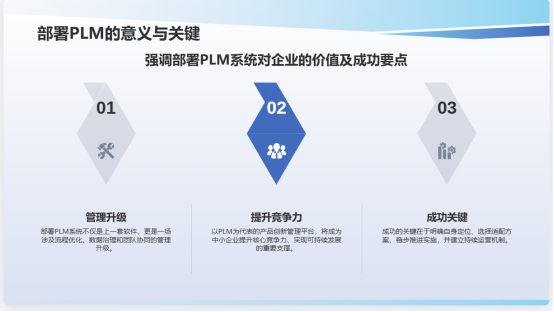 ●高层持续关注与支持:管理层应将PLM使用纳入日常管理议程,通过制度引导和考核激励促进系统应用。