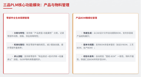 针对精密制造企业的BOM管理痛点,三品PLM系统提供了一套覆盖BOM全生命周期的数字化解决方案,从数据建模、流程管控到协同应用形成完整闭环。