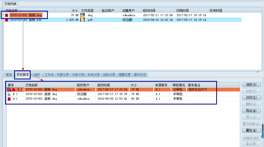 三品EDM系统有效管理所有技术文件、档案记录、管理配套文件等电子档资料,文件在修改及变更后会在系统中产生新的版本/版次,即升版,历史版本信息见下图: