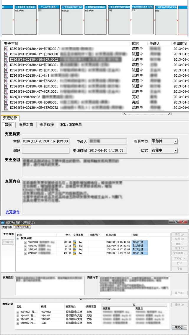 3、规范产品变更过程,理清变更零部件和物料在多个产品中的借用关系,保证变更数据不遗漏,保证相关人员按变更单据要求落实变更。