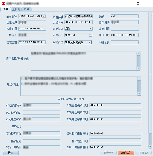 7、窗体式的表单,各部门固化的业务流程,统一平台记录管理,并与EPS系统数据集成,能够获取EPS系统数据,协助用户快速完成报表;此类窗体式的表单可直接导出pdf档文件,便于纸质外发传阅。