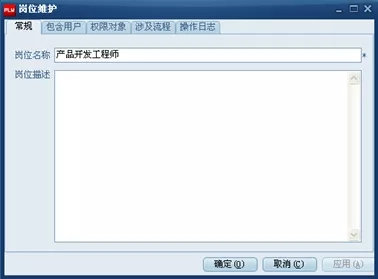 【常规】标签下设置岗位的基本信息。包括:岗位名称、岗位描述。【包含用户】该标签下,设置哪些用户被添加进入岗位。点击【添加】按钮,管理员可以将【用户】模块下的人员添加进岗位。所有这些被添加到岗位中的用户都具有该岗位所具有的特性,并通过登录系统后获得该类岗位可以执行的任务和权限。
