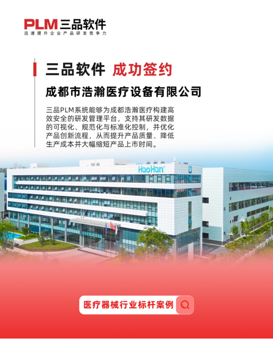 三品PLM系统能够为成都浩瀚医疗构建高效安全的研发管理平台,支持其研发数据的可视化、规范化与标准化控制,并优化产品创新流程,从而提升产品质量、降低生产成本并大幅缩短产品上市时间。此次签约三品PLM系统,预计将助力成都市浩瀚医疗设备有限公司进一步优化研发管理流程,加强产品数据的集中管理与协同效率。