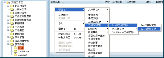 在三品PLM系统中,可便捷地基于模板创建新文档。进入【文档管理】的“工作区”,在目标位置右键选择【新建】。根据需求选择文档类型,例如依次选择【新建】→【三维CAD文档】→【Pro/E三维文档】→【Pro/E零件文档】。