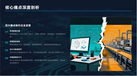 核心要点:电子制造业普遍面临研发管理粗放、数据孤岛、变更频繁、合规严苛等挑战,在深圳快节奏、高竞争环境下,这些痛点直接转化为订单交付延迟与成本失控。