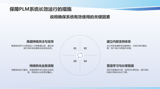 ●高层持续关注与支持:管理层应将PLM使用纳入日常管理议程,通过制度引导和考核激励促进系统应用。