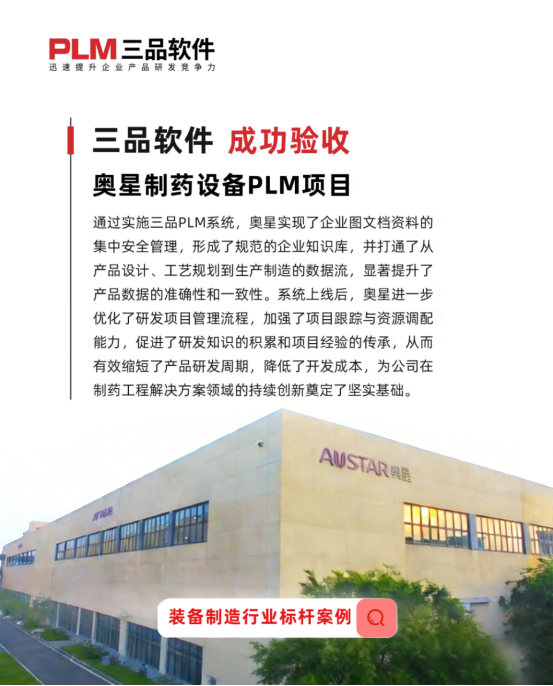 为提升研发数据的规范性与协同效率,奥星于2018年引入三品PLM系统,并于2021年完成二期增购,旨在构建企业级知识库,优化产品全生命周期管理流程 。三品PLM系统有效解决了企业在制药设备制造中常见的数据分散、版本管理混乱、跨部门协作低效等问题,通过统一平台整合设计文档、BOM清单与技术文件,实现了研发业务的电子化与无纸化管控。
