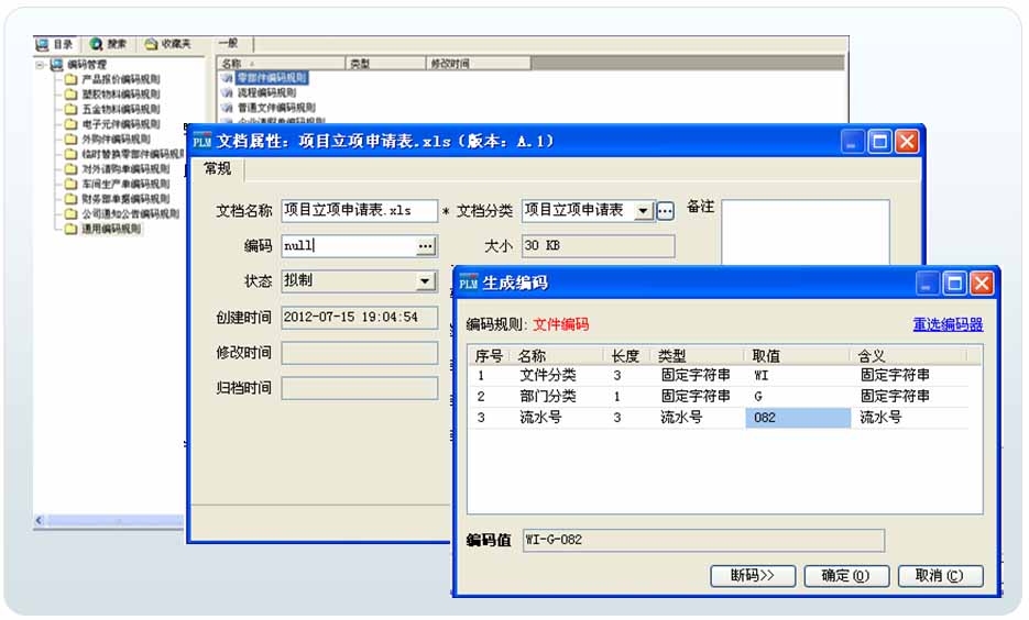 文档还可以按照类型进行管理,通过分类不仅支持用户可以模板快速创建和便捷查找,而且通过分类对同一类文档采用相同的管理策略,如文档的成熟度控制,不同文档分别有不同的编码、不同的审批流程和归档路径。图文档的具体分类在实施时会根据客户的文档种类进行组织,如产品图纸、技术合同、立项报告分类等。