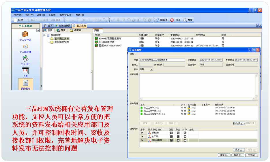 同时三品EDM系统拥有完善的发布管理功能,文控人员可以方便快捷的查看发布记录、控制发布的时效(智能回收)、管理签收工作和控制发布资料对应的应用部门的权限。发布管理是企业图文档管理很重要的一环。
