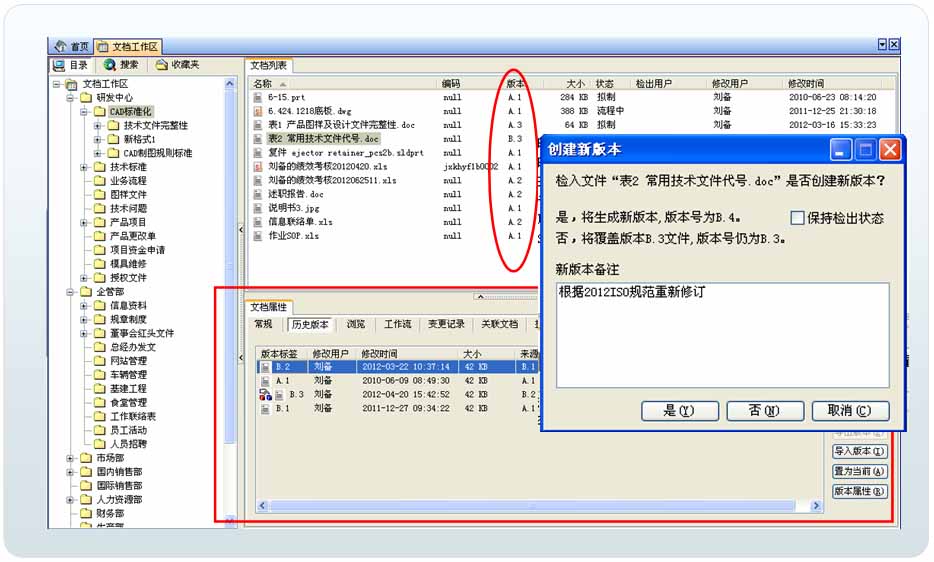 文档的版本用于控制文档的有效性及跟踪文档的变化历史。根据检入、检出、修订操作,系统将自动更新版本号,支持大版本和小版本,大的修改可以升级版本,小的改动可以升级版次。