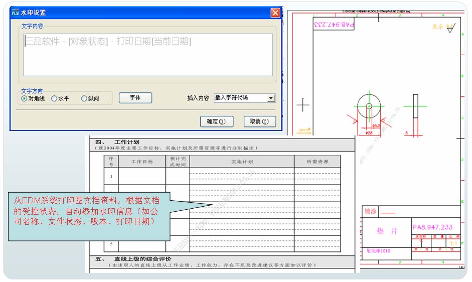 为了更好的标识企业数据管理中心的图纸等资料的受控状态,三品软件开创性的实现了打印资料的水印标识功能。当图文档需要打印时,自动添加如公司名称、文档状态、版本信息、打印日期等水印信息。