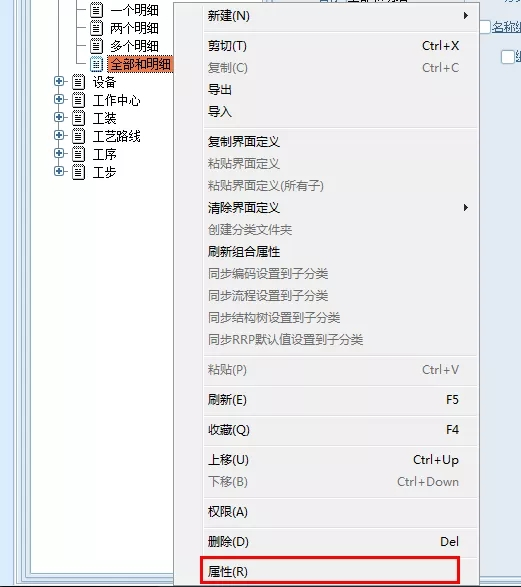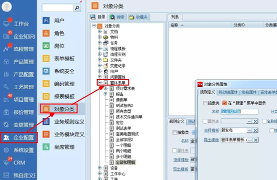 选择“企业配置”-->“对象分类”,在右边对象分类树的“窗体表单”节点下,找到需要设置的窗体表单名,点击鼠标右键,弹出右键菜单,点击“属性”。
