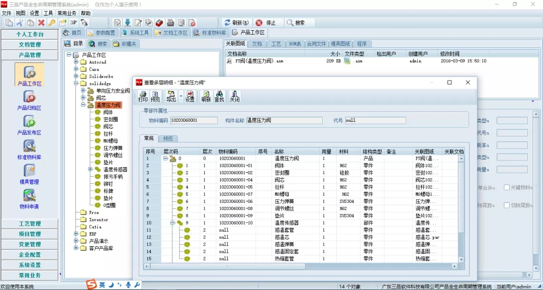 三品PDM支持“图纸驱动”的设计研发模式,对市面上常见的二维/三维机械设计CAD、电路设计EDA提供深度集成的接口和工具。其集成的三维CAD包括 Pro/ENGINEER 、Solidworks 、UG 、Solid Edge等,二维CAD包括AutoCAD、中望、浩辰、CAXA等;电子设计EDA包括Protel/AD,Cadence等。一方面系统能够从已完成的图纸中提取物料的属性信息和装配信息,自动生成产品结构树和BOM物料清单;更深入地,三品PDM提供集成在设计软件中的在线菜单,实现从设计软件中对三品PDM存储的数据进行查询、获取、编辑等操作;系统还提供细致的设计辅助功能,当工程师修改图纸时,自动判断有相互装配关系或相互参数约束关系的图纸,避免设计改动的遗留,提高设计输出的准确率。