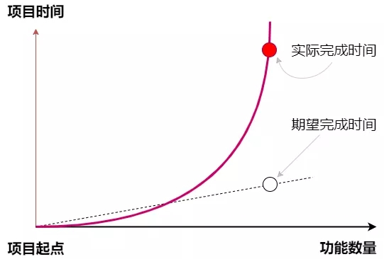 您一定注意到了,随着功能的增加,或者说随着任务复杂度的增加,下属完成任务的实际时间,往往超出预期,这是因为很多任务中的功能要求集合,属于幂律分布(爆炸式曲线分布),而不是领导以为的正态分布(平均水平分布或直线分布)。
