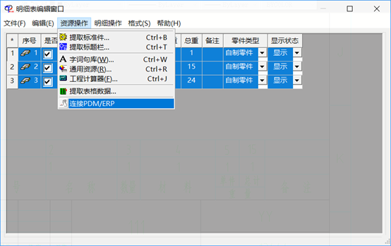 选中所有行,选择资源操作—“连接PDM/ERP”:
