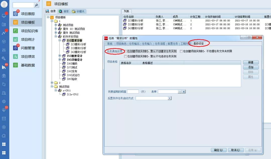 在项目管理模块,可以对一个项目或任务的属性界面的“高级设定”标签页,点击“任务通知设置”链接,调出任务通知设置界面: