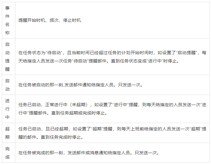 对各类事件的提醒开始时机、频次、停止时机汇总如下表: