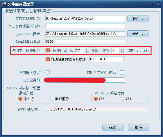 (5)点击“配置”—“文件服务器配置”,打开配置窗口,勾选“启用文件同步服务”并设置开始时间和持续时间后,点击“确定”完成配置。