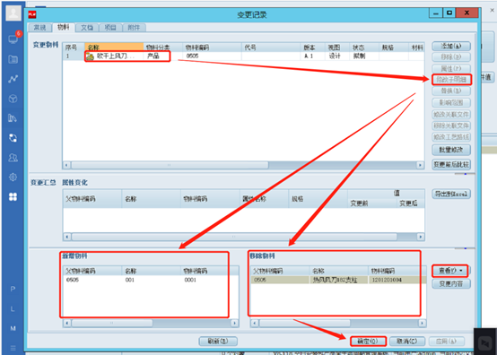 下面只是显示替换一个物料的操作,可以浏览到新增物料与移除的物料,修改无误后点击确定即可,变更记录已经做好,只需创建工作流进行变更生效,如图5所示: