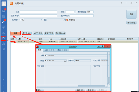 与普通流程不一样,变更审核是在变更管理→变更审核→选择变更记录→编辑在确保变更操作内容无误后确定→保存编辑,提交工作流,如图7、图8 所示: